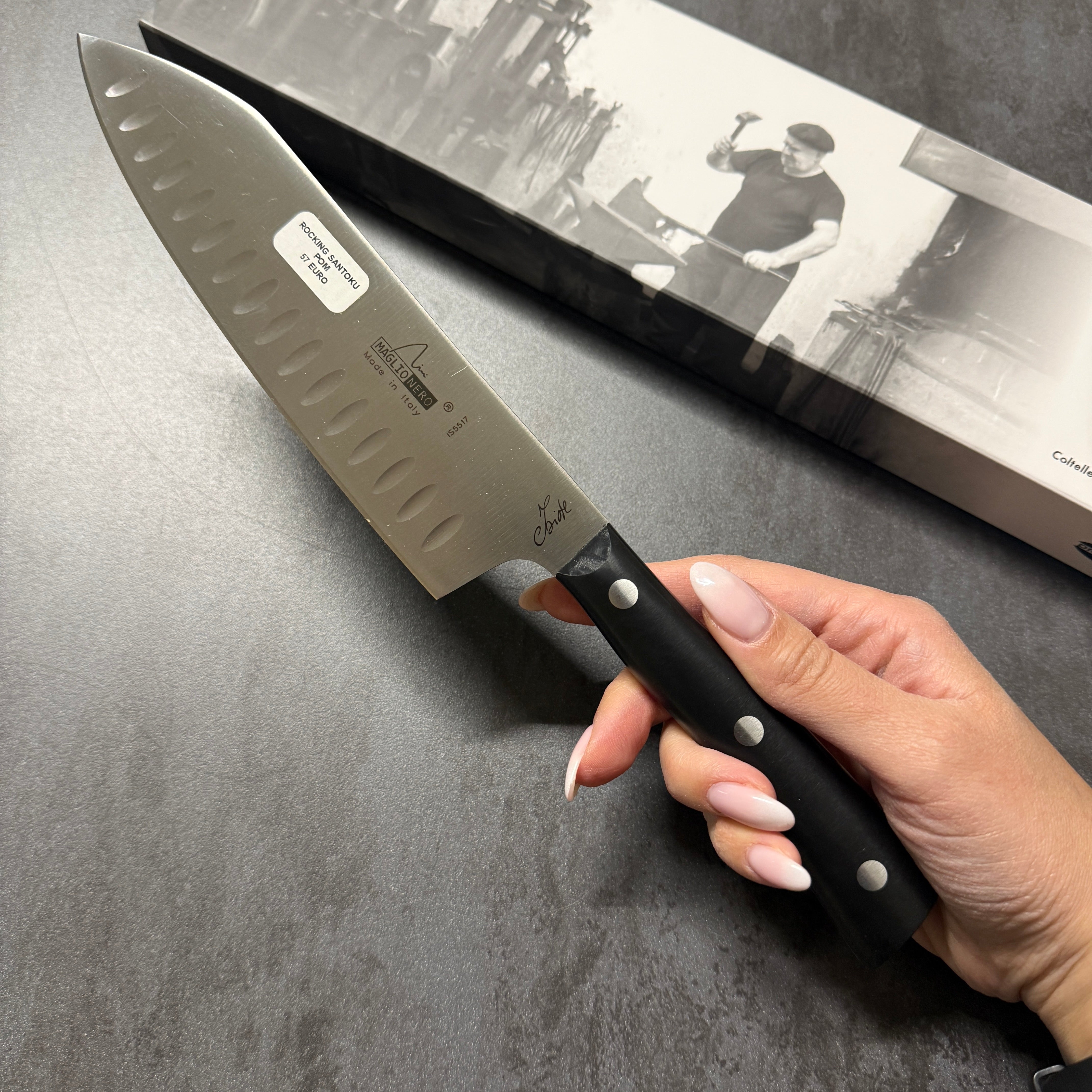 Scopri il coltello professionale Santoku della linea Iside: un alleato in cucina per tritare e sminuzzare con facilità. Con la sua lama ampia e il manico in pom , ogni preparazione diventa un'esperienza straordinaria, rendendo il tuo lavoro un gioco da ragazzi!