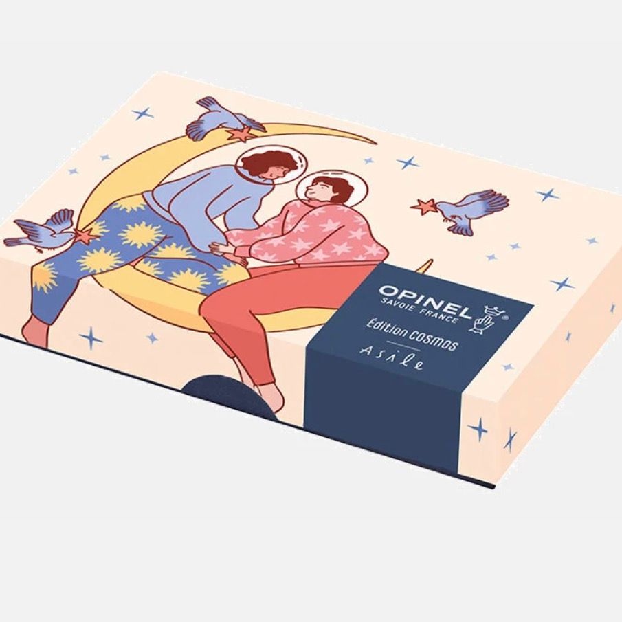 Il N. 08 Cosmos Asile presenta due personaggi diversi, ma uguali. Qui non c'è dualità, ma un binomio, un equilibrio. La Luna su cui siedono diventa uno spazio d'incontro e di delicatezza, tra sogno e realtà. Tre uccelli portano delle stelle attorno a loro, come se stessero ridisegnando una costellazione.