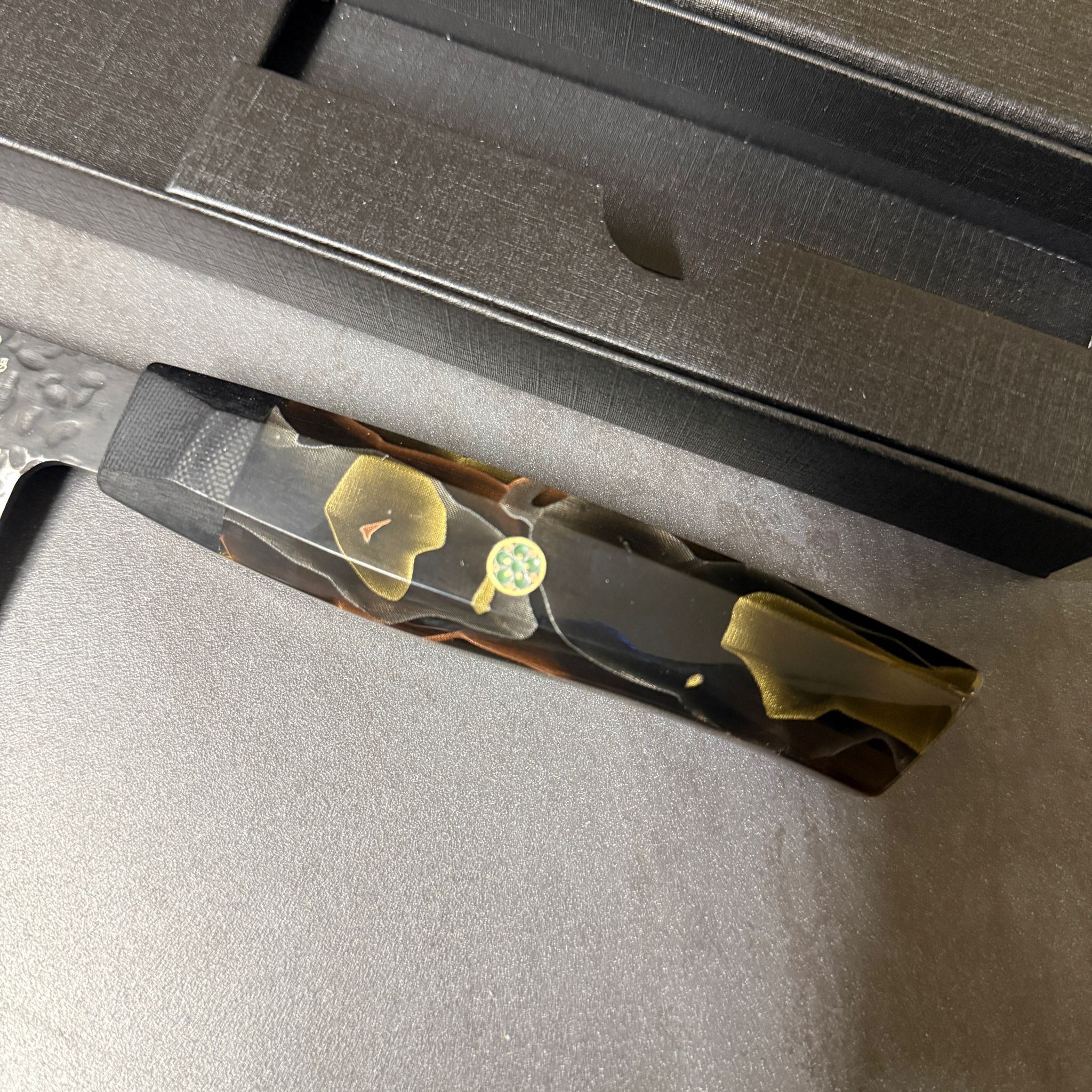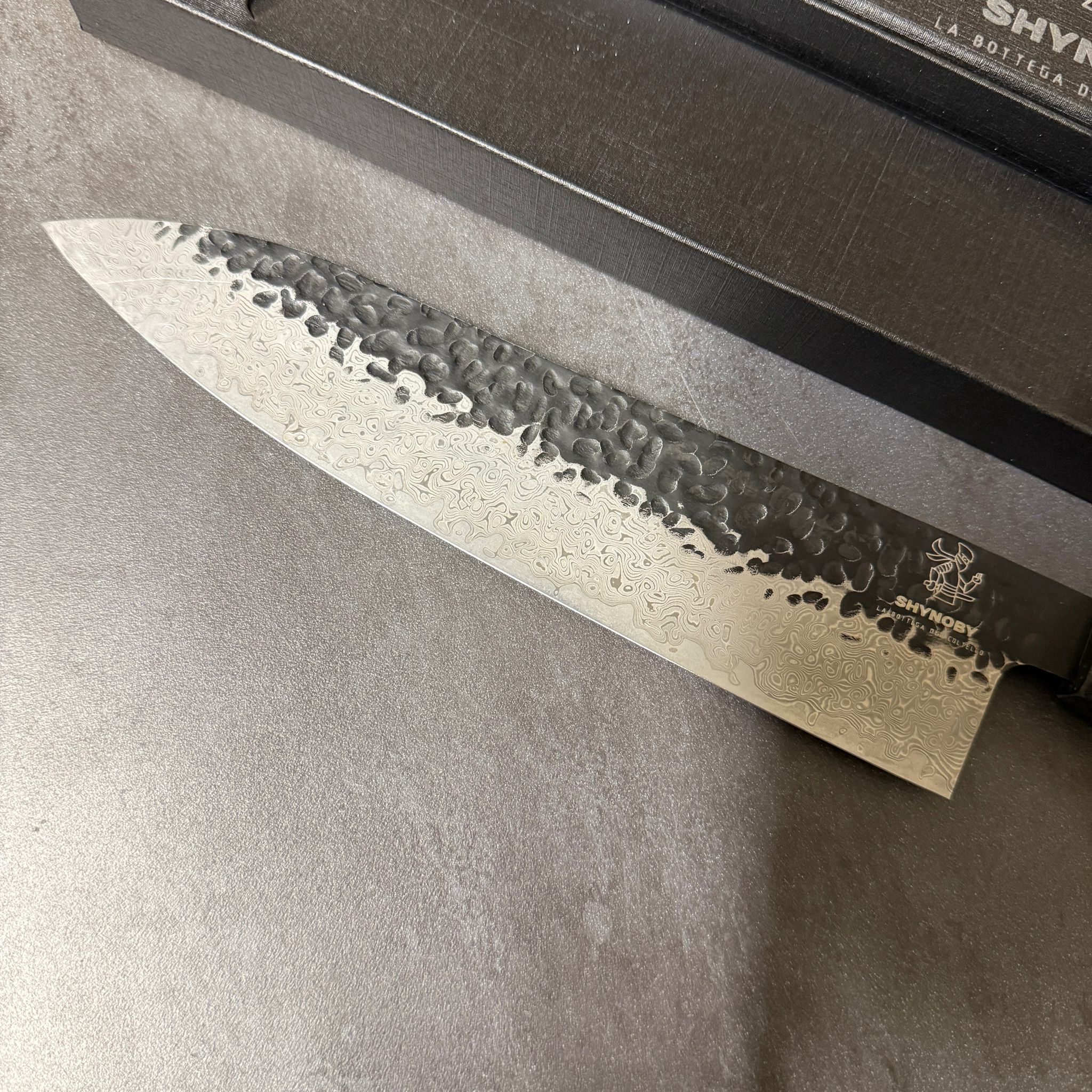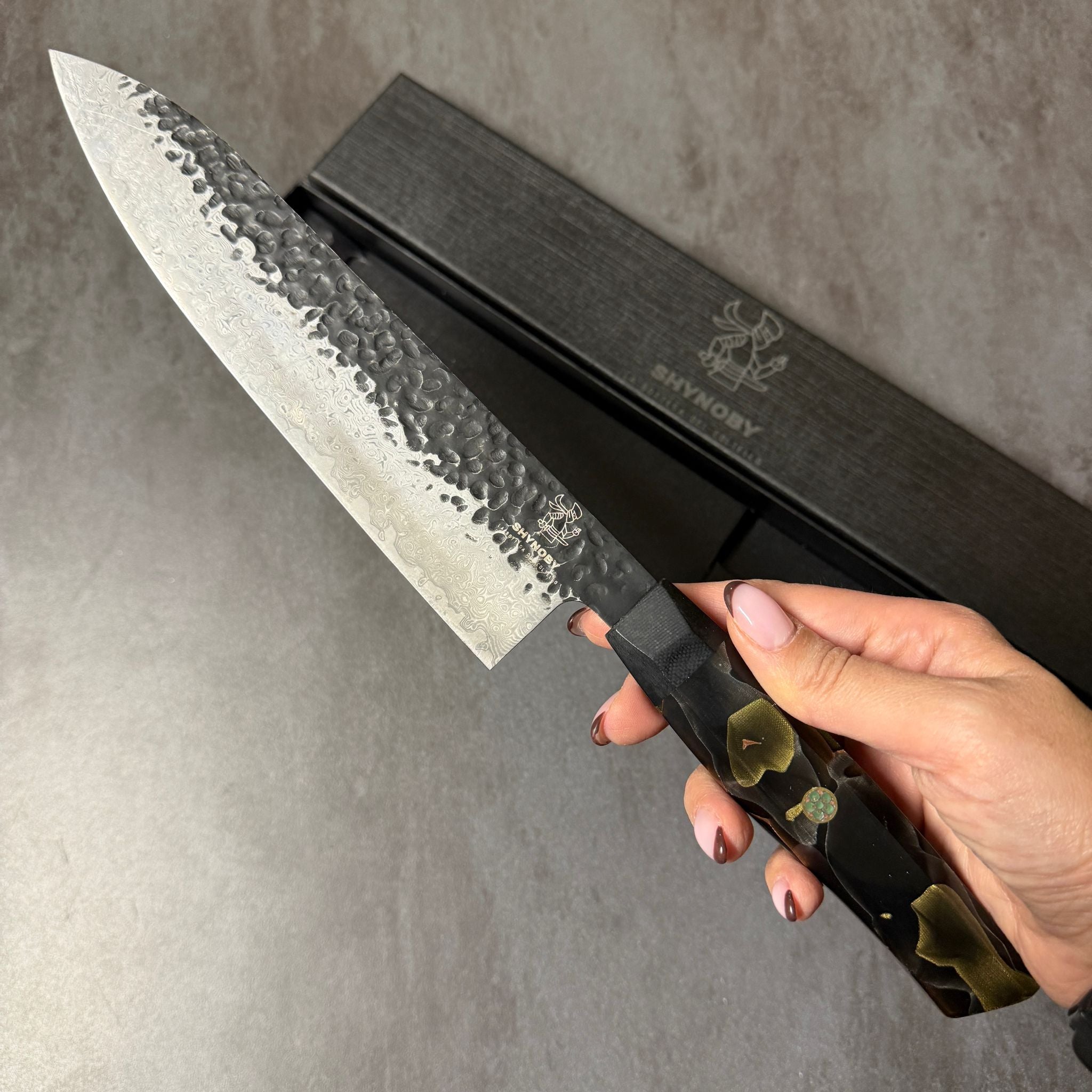Lo Shynoby Hammered Pro - Trinciante 22cm è il coltello perfetto per i professionisti grazie alla sua lama martellata in Damasco con 67 strati e anima centrale in VG10. Il manico in resina nera con inserti oro, bronzo e argento e fibra di carbonio, garantisce una presa salda e confortevole per un'esperienza di taglio impeccabile. Con questo coltello, ogni taglio diventa un'opera d'arte.