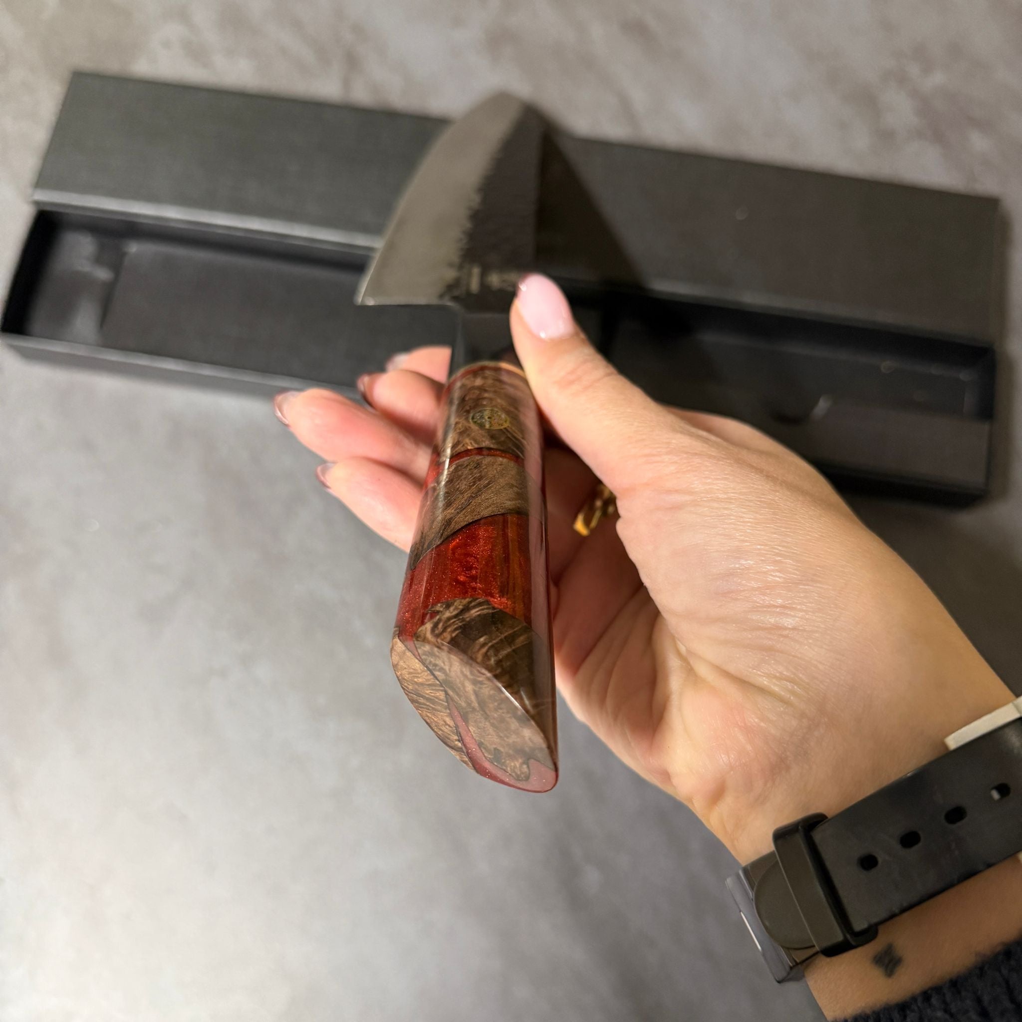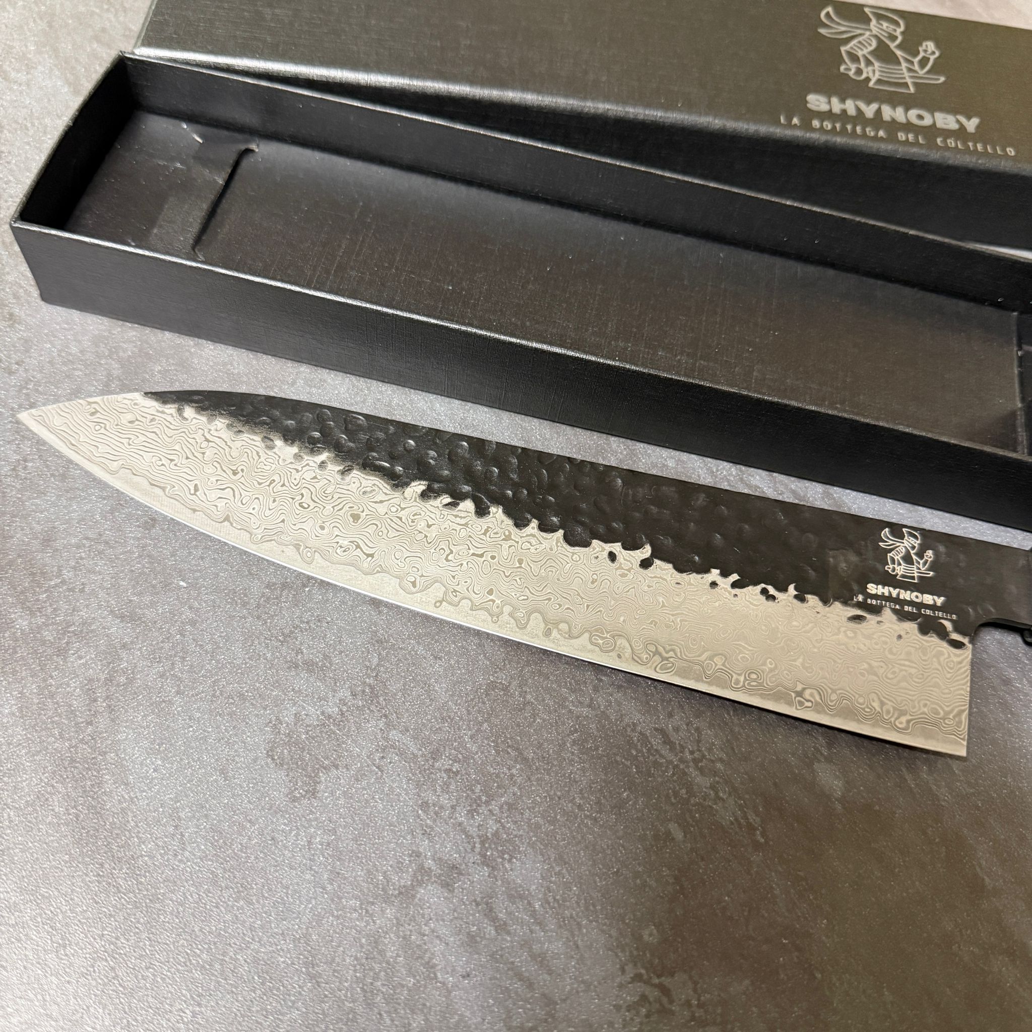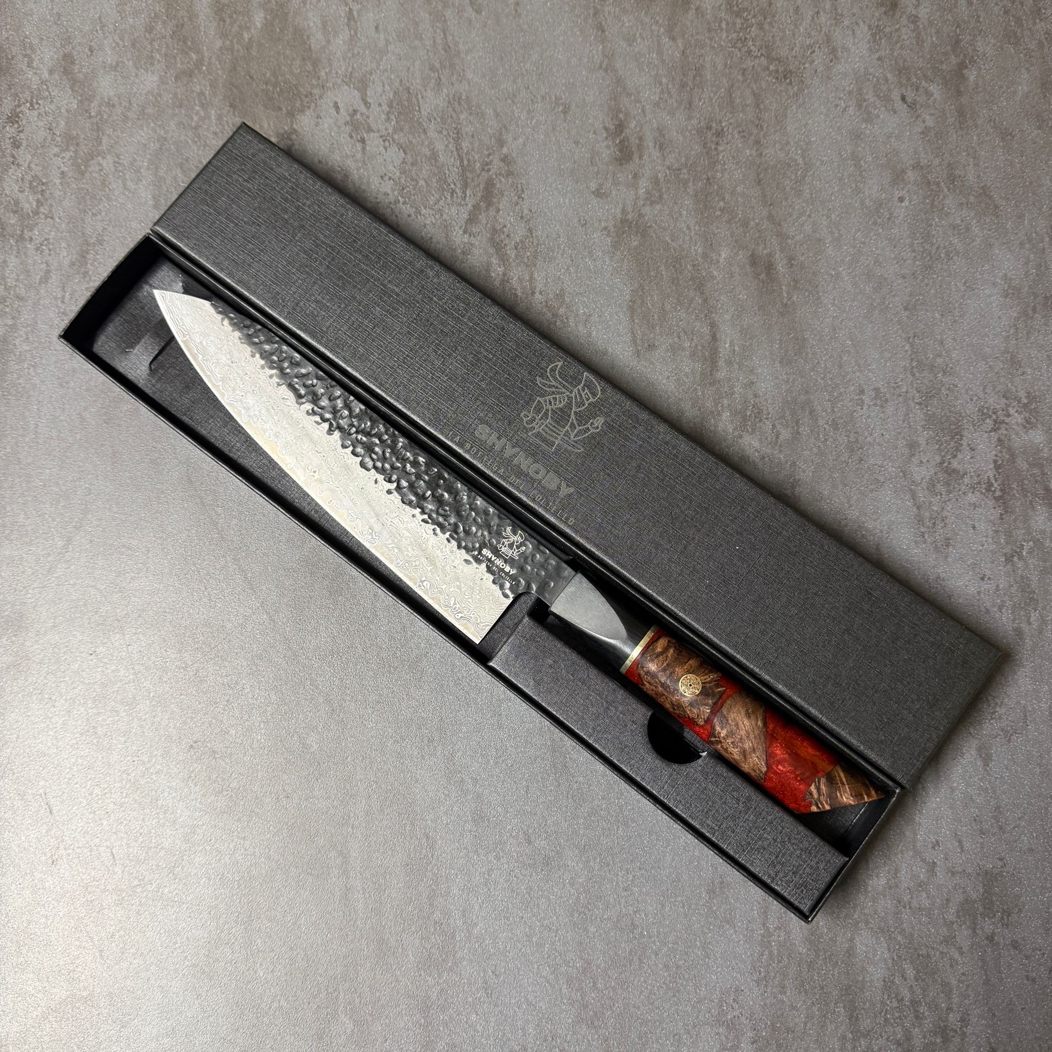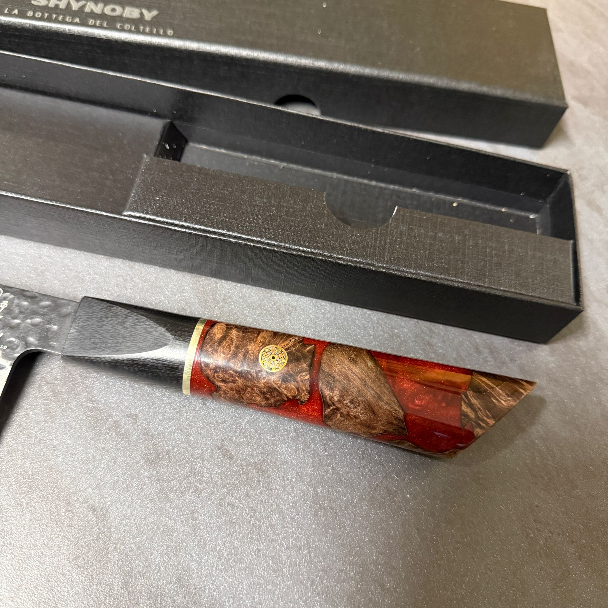 Lo Shynoby Hammered Pro - Trinciante 22cm è il coltello perfetto per i professionisti grazie alla sua lama martellata in Damasco con 67 strati e anima centrale in VG10. Il manico in radica stabilizzata rossa e fibra di carbonio garantisce una presa salda e confortevole per un'esperienza di taglio impeccabile. Con questo coltello, ogni taglio diventa un'opera d'arte.