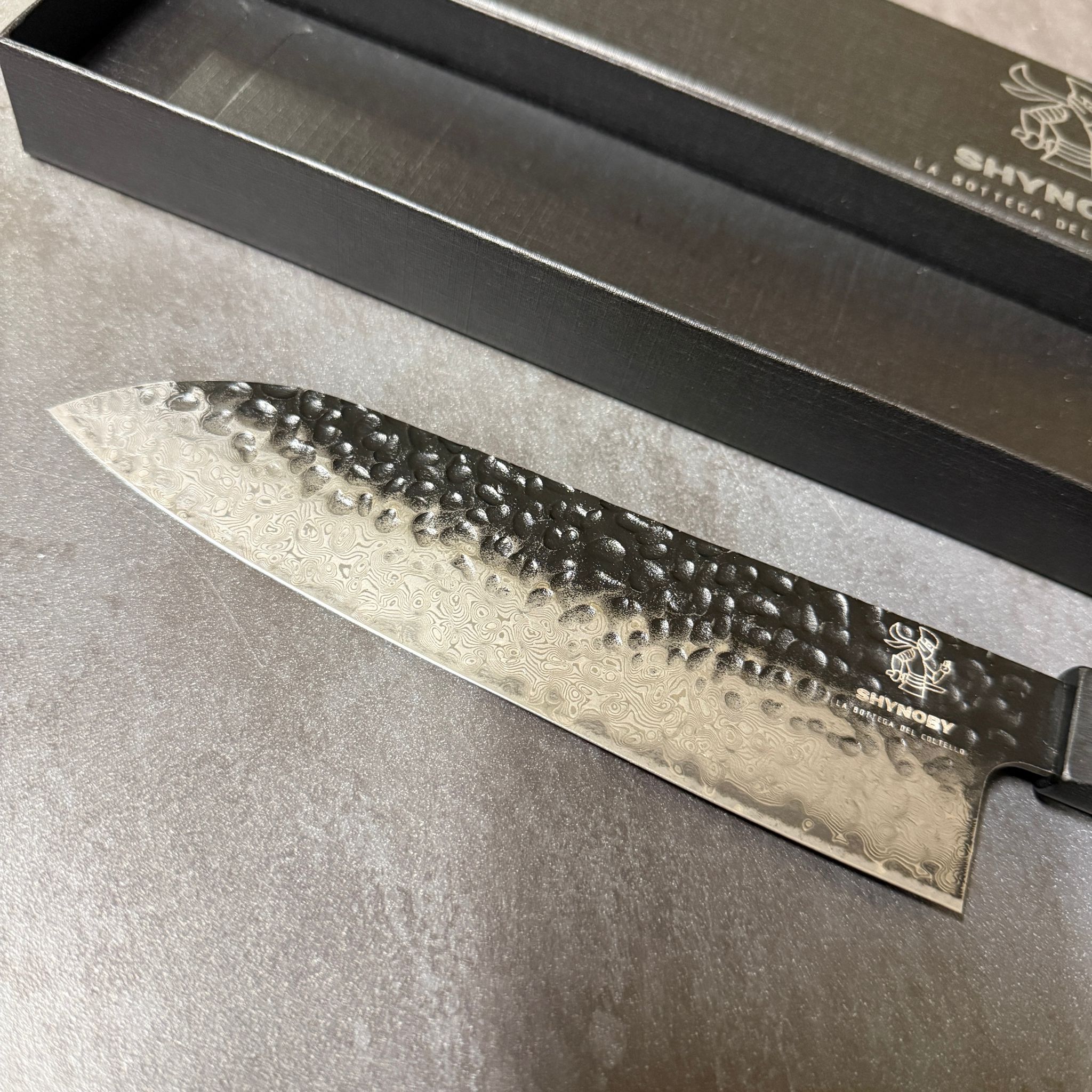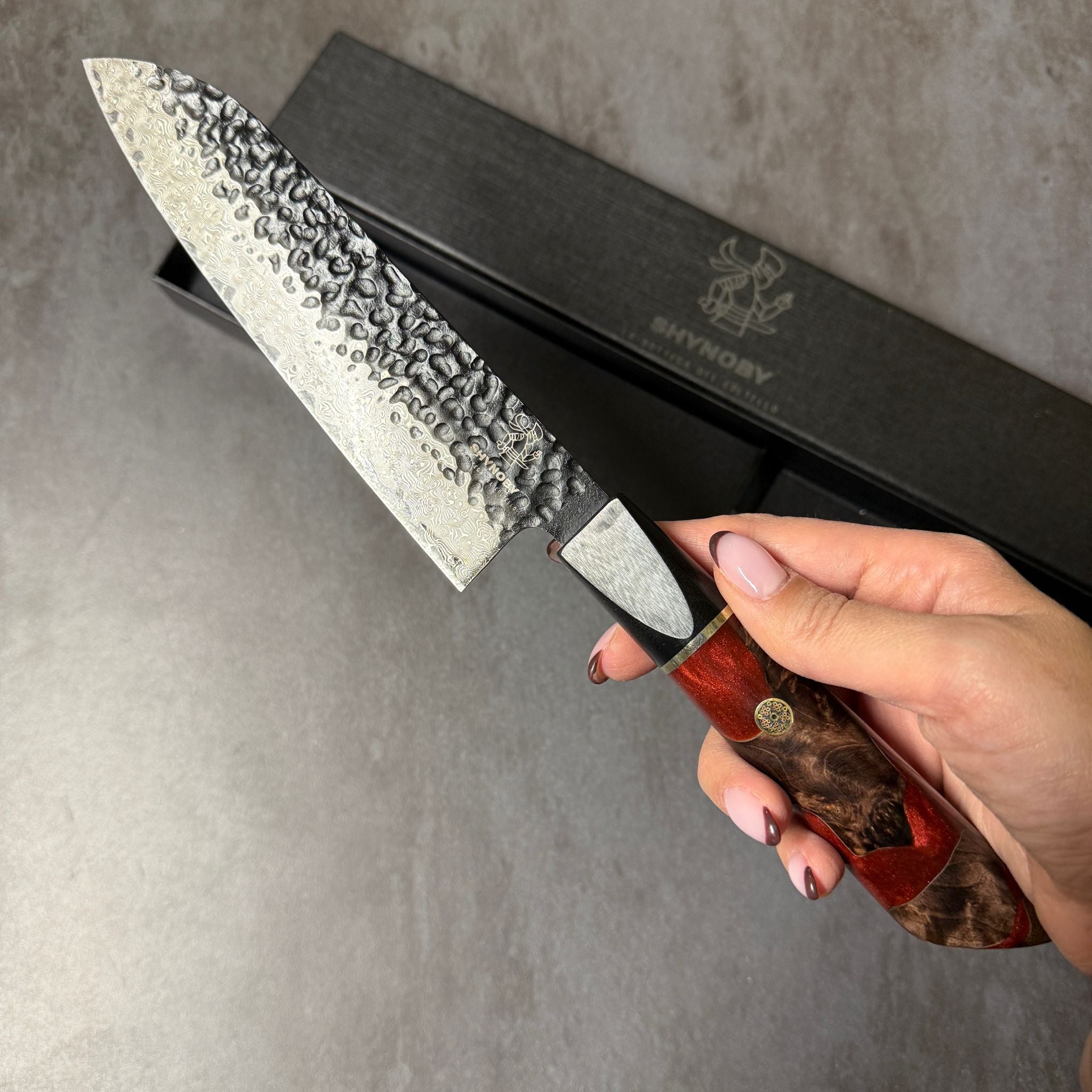 Lo Shynoby Hammered Pro - Santoku è il coltello perfetto per i professionisti grazie alla sua lama martellata in Damasco con 67 strati e anima centrale in VG10. Il manico in radica stabilizzata rossa e fibra di carbonio garantisce una presa salda e confortevole per un'esperienza di taglio impeccabile. Con questo coltello, ogni taglio diventa un'opera d'arte.